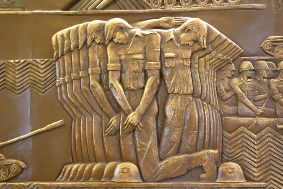 הלוח המוקדש למלחמה מציג את צליחת התעלה, מלווה בחילות האוויר, השריון והצנחנים של מצרים, ובקדמתו מוצגת קבוצה גדולה של שבויי מלחמה ישראלים שפופי ראש, כורעים על ברכיהם לצד קסדות שעליהן חקוק מגן דוד. חלקם מניפים את ידיהם לכניעה, אחרים מסתירים בידיהם את אזור החלציים במעין אקט של בושה וכניעה.