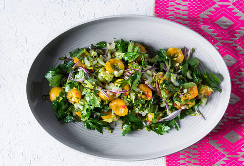 סלט משמשים עם סלרי, פלפל חריף ופיסטוקים