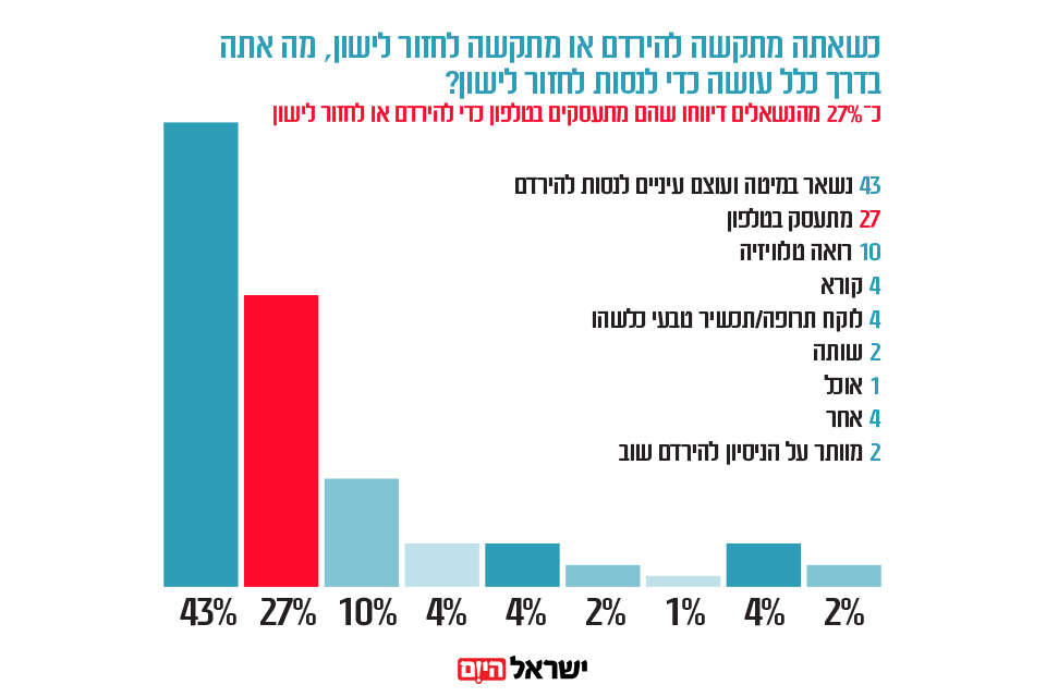 היעדר השינה מוביל, על פי הסקר, בעיקר למצב רוח ירוד (רוב הנשאלים העידו על כך), לעצבנות ולהפחתת היעילות בעבודה, בסדר הזה. מה עושים הישראלים העייפים כדי להירדם? על פי תוצאות הסקר, 27% מאיתנו מתעסקים לפני השינה בטלפון הנייד - רעיון גרוע במיוחד, לדברי כל המומחים לשינה, 20% נטלו השנה כדורי שינה, ו־10% סיפרו שפנו השנה לגורם מקצועי בניסיון לפתור את הבעיה.