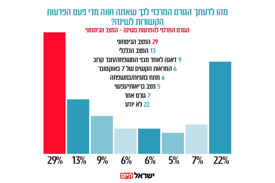 עוד נמצא כי 78% מהישראלים חווים הפרעות בשינה לפחות פעם בשבוע, כי הגורם המרכזי להפרעות בשינה - ובפער ניכר - הוא המצב הביטחוני (הרבה אחריו נמצא המצב הכלכלי), וכי 40% מהישראלים מכירים אדם שחווה בעיות שינה במהלך השנה האחרונה.