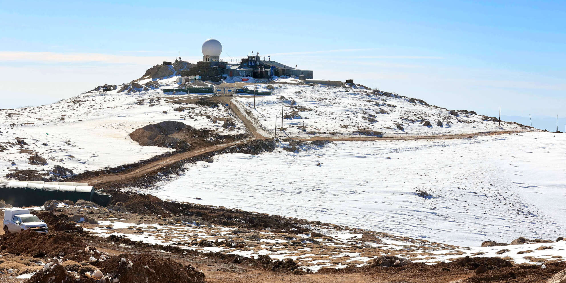 במבט צפונה, שלוחה אחת מתחתינו, נמצא "הוטל בייס" - המוצב המרכזי של כוח האו"ם שמפקח על הסכמי הפסקת האש שנחתמו ב־1974. הכוח הזה, אונדו"ף, מחזיק בעשרות מוצבים בכל רחבי הרמה. בחרמון הסורי יש לו שלושה: "הוטל דרום", "הוטל בייס" ו"הוטל צפון", שנמצא בפסגת ההר בגובה של 2,814 מטר.