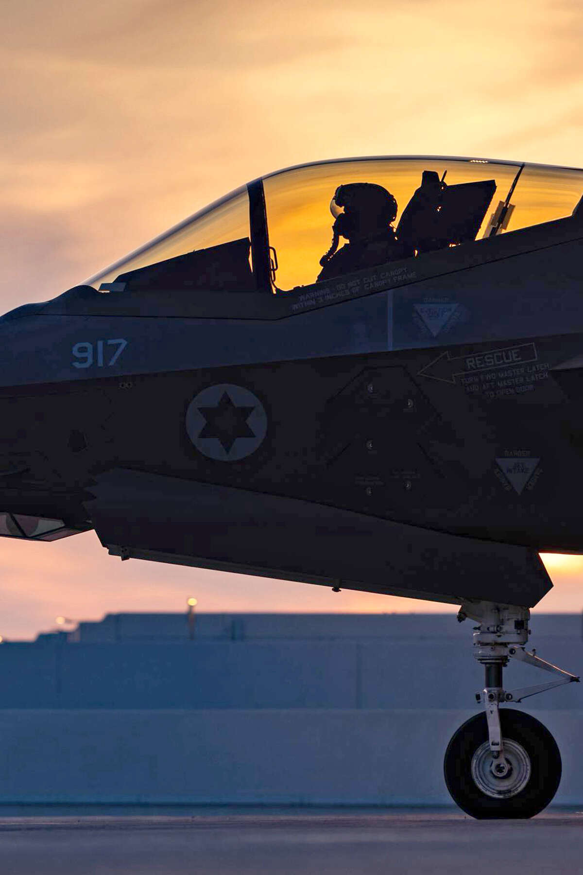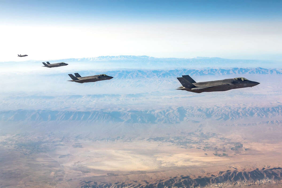 מבנה הדוק ומתואם של מטוסי אדיר עושה את דרכו מעל שטח אויב, בדרך לתקיפה עוצמתית באיראן