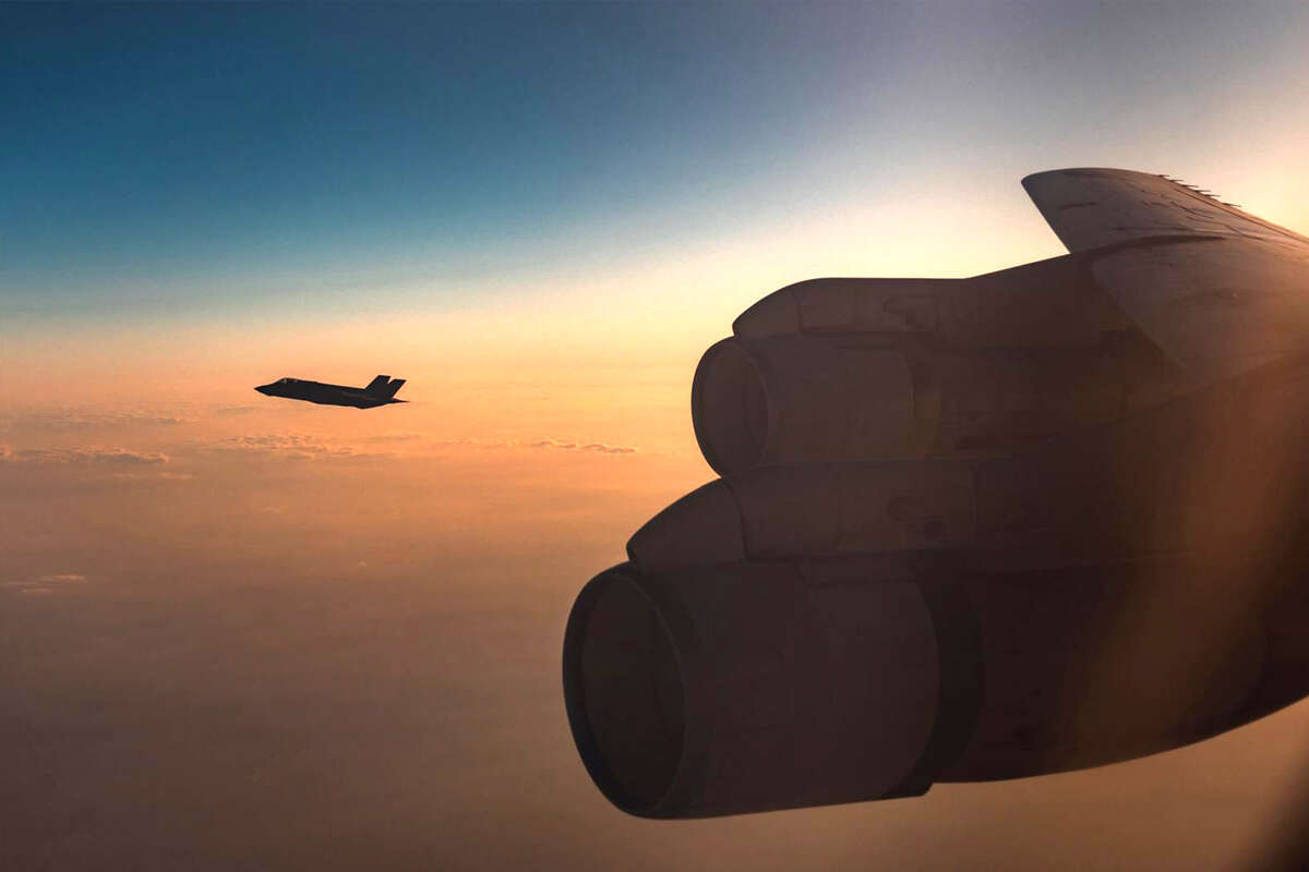 ליווי שמימי. מטוס אדיר בדרך לאיראן, כפי שנצפה מזווית ייחודית ונדירה - מתוך מטוס התדלוק שמלווה אותו במשימה הארוכה