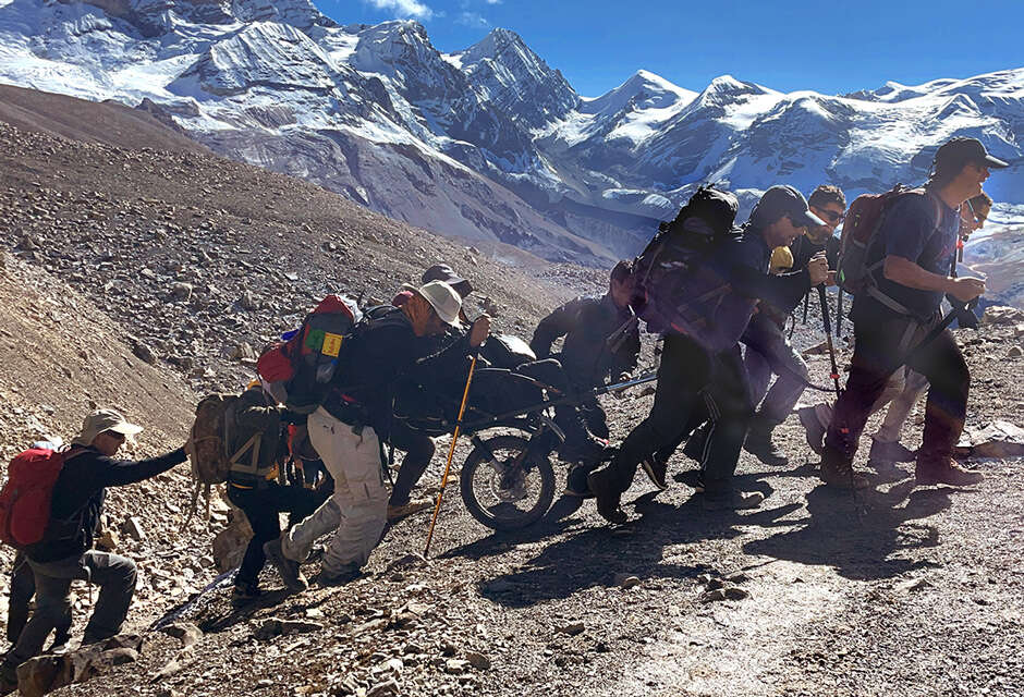 למרות החמצן הדליל בגבהים, הם נשאו בידיהם את הגילגולונים הכבדים, כשהנכה יושב בהם, מתנשפים מהמאמץ האדיר, וכל זאת עד לגובה הבלתי נתפס של 5,416 מטרים מעל פני הים. למסע הצטרפו גם 40 סבלים (פורטרים) נפאלים, שבקיאים בסביבה ובאתגריה.
