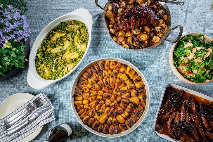 מניחים את רולדת הטלה בתבנית שמתאימה לתנור, מפזרים סביבה את תפוחי האדמה והתמרים ויוצקים מעל את המים. מכסים בנייר אפייה ואז ברדיד אלומיניום או במכסה (נייר האפייה מונע העברת הטעם והצבע של רדיד האלומיניום לבשר), אופים במשך שלוש שעות בטמפ' של 170 מעלות ולאחר האפייה מעלים את הטמפ' ל־200 מעלות, מורידים את הכיסוי ומשחימים כ־25 דקות נוספות. בהגשה, לא לשכוח להוציא את החוט.