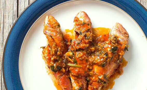 יוצקים למחבת כחצי כוס שמן זית ועל אש סבלנית מטגנים את השום, חצי מכמות הפטרוזיליה, ואת הסלרי, עד שפני השום מתחילים להזהיב. מוסיפים פנימה את העגבניות, ממליחים ומפלפלים, טועמים ומתקנים תיבול. תנו לעגבניות להתבשל היטב וערבבו אותן לעיתים קרובות. מניחים את הברבוניות ברוטב ומבשלים אותן. אם הן קטנות, אין צורך להפוך אותן. מוציאים את הברבוניות מהמחבת, אחת בכל פעם, כדי שלא לשבור את הדג, מפזרים מעל את שאר הפטרוזיליה הקצוצה ומגישים.