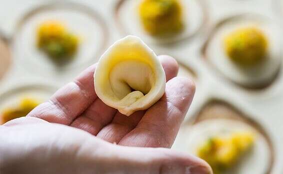 בד בבד, מחממים תנור לחום של 200 מעלות ואופים בו כחצי שעה את קוביות הדלעת, עד שישחימו פניהן ומזלג יינעץ בהן בקלות. מצננים את הקוביות, מועכים בקערה קטנה ומערבבים עם שאר חומרי המילוי. כעת, אחרי שנח מספיק, מקמחים את הבצק בקמח שנותר ומרדדים אותו במכונת פסטה, או על משטח מקומח, לעובי של 1.5 מ"מ לכל היותר. לא מציקים לבצק ולא לשים אותו, אחרת שוב תצטרכו לשלוח אותו לנוח.