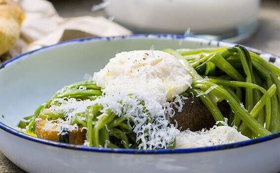 הרכבת המנה: מניחים על כל פרוסת לחם תרד טורקי וביצה עלומה אחת, מוזגים מעט מהרוטב שנוצר במחבת התרד, מגררים פרמזן מעל, זורים מעט פלפל שחור גרוס ומגישים.