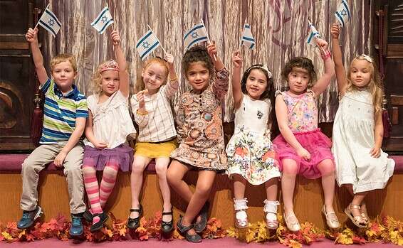 "בתמונה רואים קבוצה של ילדי גן רפורמי במהלך טקס חניכה (אופייני לקהילה הרפורמית) בחג שמחת תורה בבית הכנסת 'טמפל סיני' בפיטסבורג, פנסילבניה".
