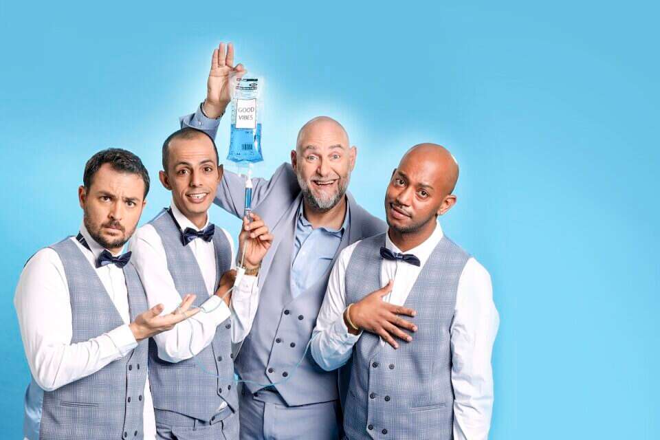 הדר ושלישיית הסטנדאפיסטים. "ההומור הוא נשק. הוא החזיק את היהדות, על מהגריה. הומור שבא מתוך כאב אמיתי ומתוך מציאות אמיתית הוא הומור שמעיף", אומר הדר // צילום: כפיר זיו