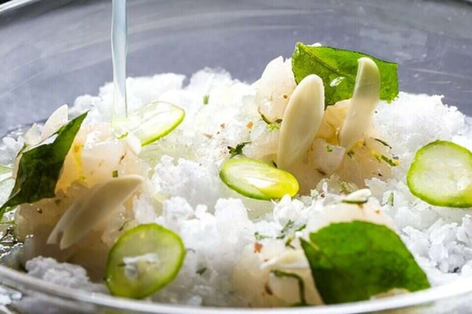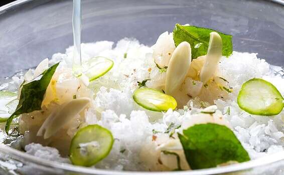 הרכבת המנה: מניחים בכל צלחת הגשה 2 כפות מהטרטר בצורת תלולית, מפזרים מעל מעט גרניטת ג'ין וטוניק, מקשטים בפרחי זוטה לבנה ומוזגים 4 כפות מהקונסומה לכל צלחת.