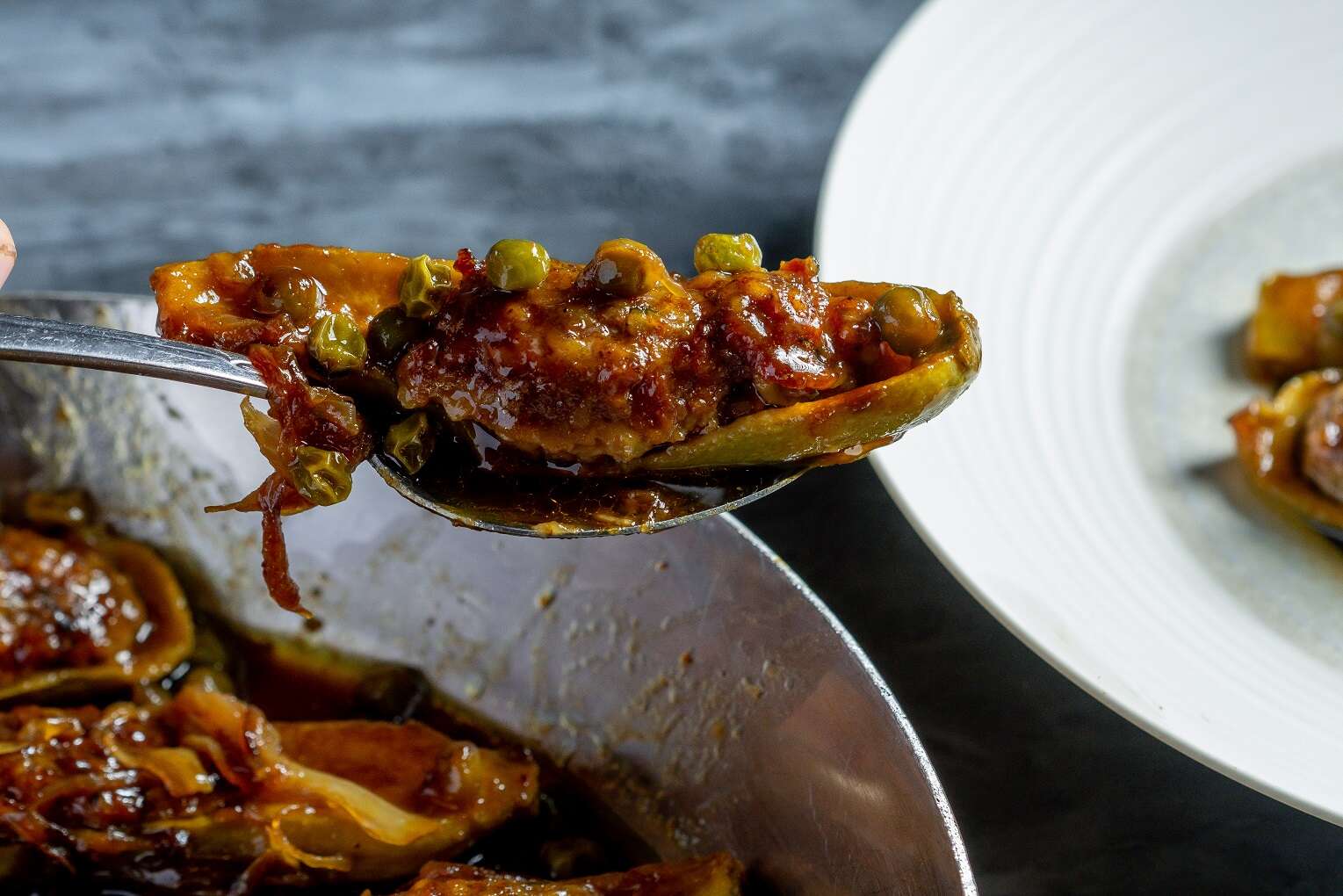 סירות קישואים ממולאות בשר ברוטב אפונה ובצל
