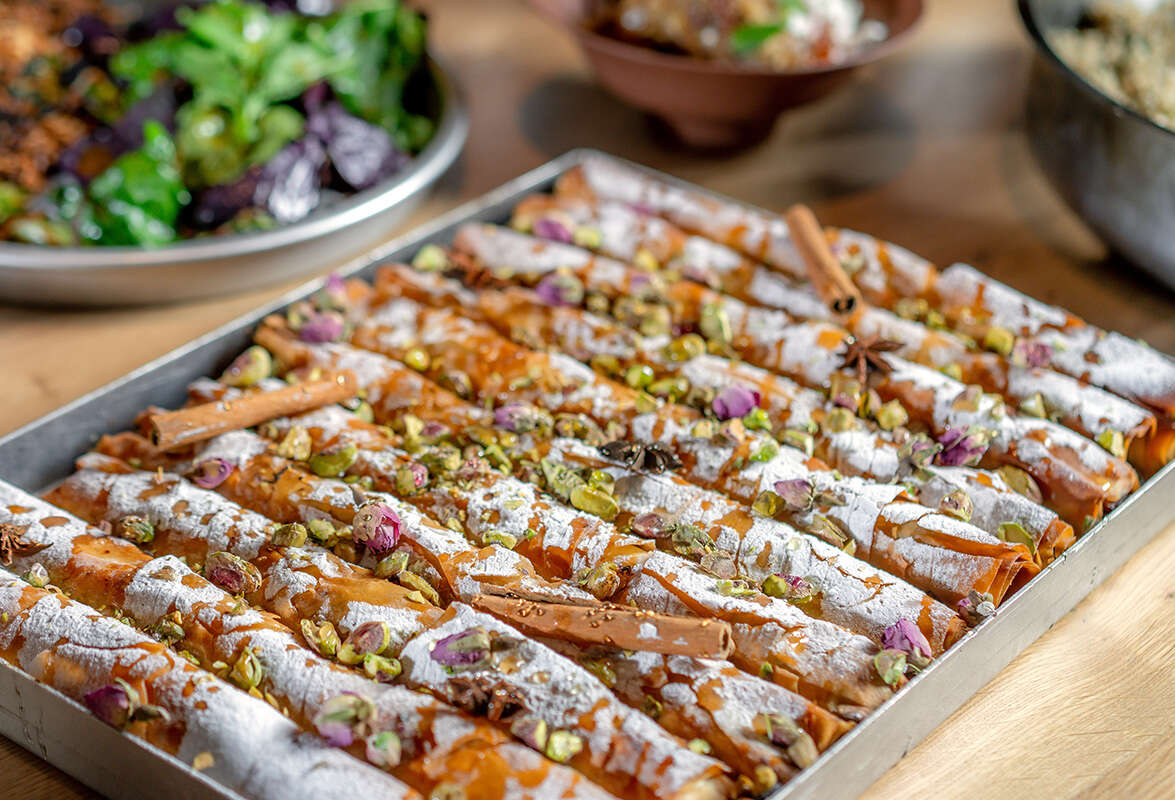 מוציאים מהתנור, מקשטים באבקת סוכר, בפיסטוקים קצוצים ובעלי ורדים מיובשים, ומזלפים דבש לסיום.