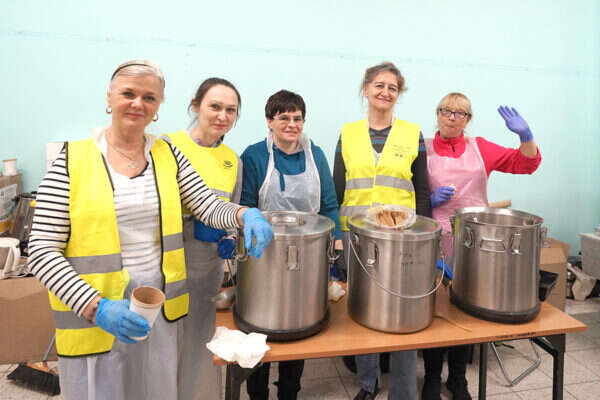 הנוכחים משלשלים תרומות לתוך קופסה בצבעי דגל אוקראינה. "מחסני הארגון מלאים בציוד שיחולק מחר לפליטים שהגיעו לכפר שלנו", מתגאה טדאוש ומציג מחסנים גדושים בבגדים ובאוכל - ואפילו במזון לחתולים.
