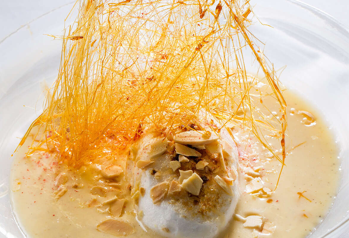 הרכבת המנה: בקערה מערבבים את קרם האנגלז עם האמרטו כדי לפתוח את הקרם. בצלחת עמוקה מסדרים שכבה של הקרם ובמרכז מסדרים את קנל המרנג הרך (האחד או השלושה הקטנים). מפזרים מסביב את קומפוט הפירות והשקדים, ומניחים מעל שערות סוכר. מפזרים מלמעלה אבקת פטל ומגישים.
