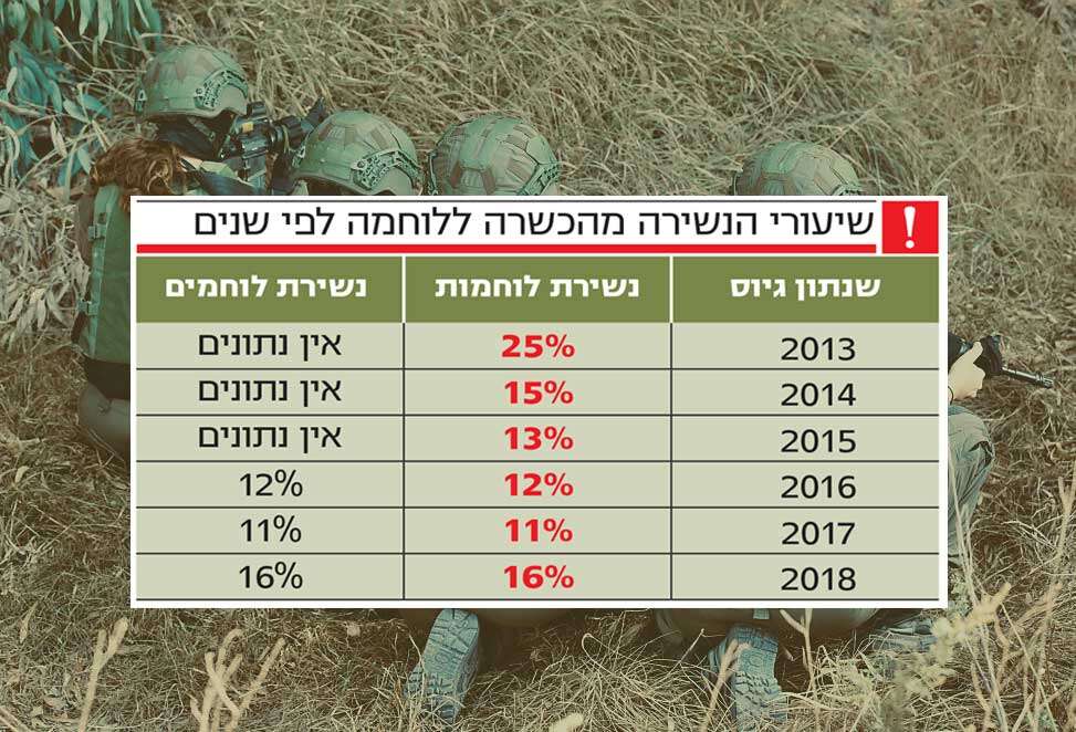אלא שטענה זו היתה נכונה רק בעבר. מהנתונים שמסר צה"ל ל"ישראל היום" עולה כי ב־2013 עמדה הנשירה מיחידות החי"ר הקל, חיל התותחנים, חיל האיסוף הקרבי, ההגנה האווירית ופיקוד העורף על 25%. המשמעות היא שבאותה שנה אחת מכל ארבע לוחמות שהתגייסה לשירות קרבי, נשרה בתקופת ההכשרה ועברה לתפקיד עורפי.