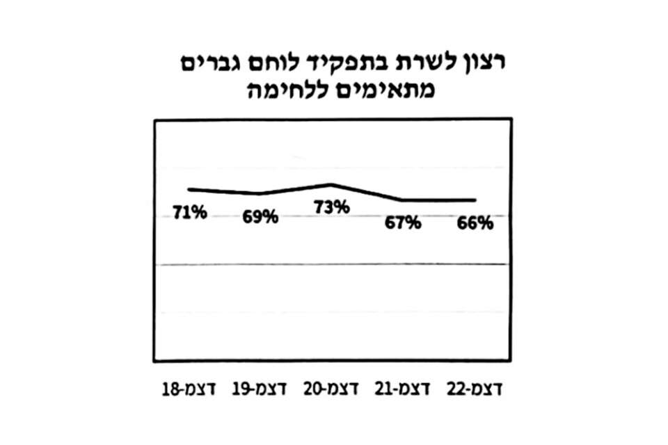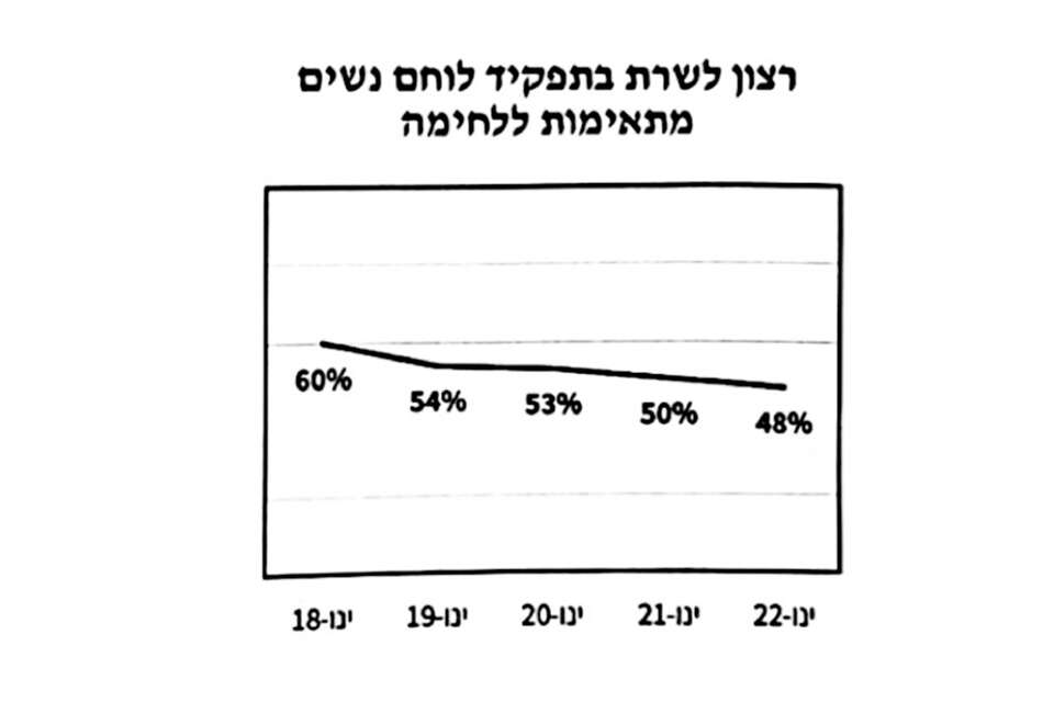 בקרב נשים, הירידה משמעותית אף יותר: בשנת 2022 רק 48% מהמתגייסות הביעו רצון לשרת בלחימה, בהשוואה ל־50% בשנת 2021, 53% בשנת 2020 ו־60% ב־2018. נוכח המגמות, ניתן לשער כי הנתונים בסקר שייערך בסוף השנה הנוכחית יהיו נמוכים אף יותר.