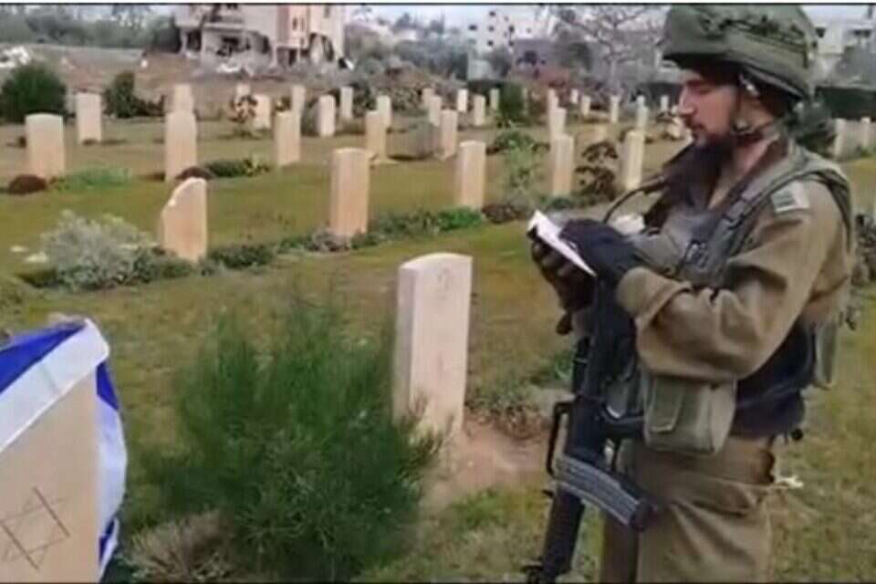 "אנחנו נמצאים בבית הקברות האנגלי בעזה", אמר החייל שתיעד את הרגע לקול מסוקים והפצצות הנשמעים ברקע. "בין חללי מלחמת העולם הראשונה הבריטים, היו גם לוחמים יהודים שנפלו במלחמת העולם הראשונה, ונגיד כאן קדיש".