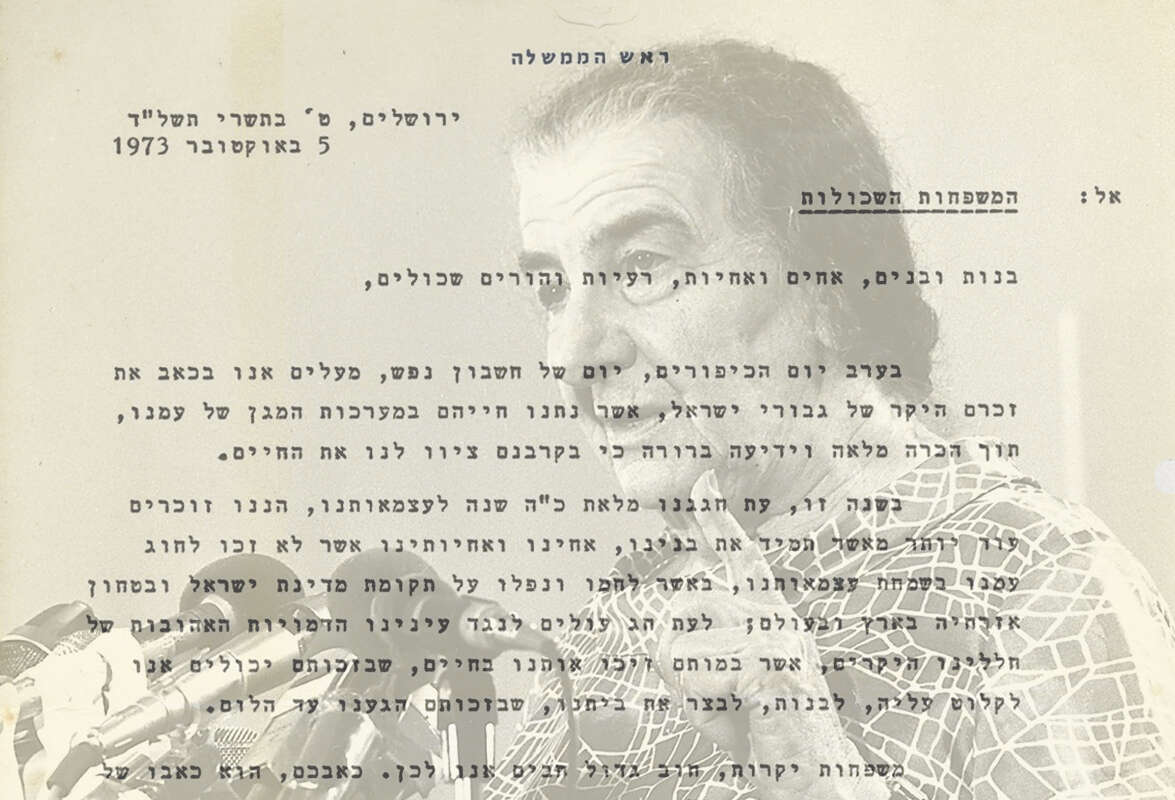 במסגרת התכתבות זו, שלחה גולדה מכתב גם בערב יום הכיפורים. "בערב יום הכיפורים, יום של חשבון נפש, מעלים אנו בכאב את זכרם היקר של גיבורי ישראל", כתבה גולדה במילים שמוארות באור ייחודי בשל האסון העתיד להתרחש. "לעת חג עולות לנגד עינינו הדמויות האהובות של חללינו היקרים, אשר במותם זיכו אותנו בחיים", הוסיפה.
