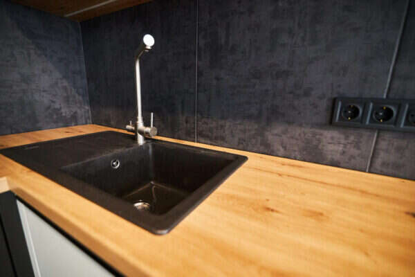 יש מטבח בוטיק שנעשה מעץ סנדביץ’ איכותי מצופה פורמייקה משני צדדיו במראה של שיש או בטון, עם אופק של סגנון תעשייתי מינימליסטי כפי שמככב היום כתת סגנון המודרני השולט בעולם הלייף סטייל העכשווי וכמובן יש מטבח מעץ מלא.