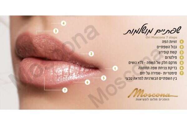 על מנת להתאים את מבנה השפתיים לפנים של המטופלת אורי מוסקונה פיתח שיטה ייחודית ליצירת שפתיים מושלמות מלאות ונחשקות, עם מראה טבעי בתמונה רשומים 7 האלמנטים.