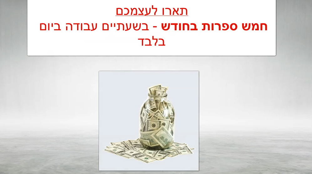 כי כשיש לכם את החומר הנכון, הידע הנכון, המנטור הנכון, בדגש על זה שאכפת לו- יש לכם את כל הבטחון. וכשיש את הבטחון- הכסף מגיע מעצמו.”