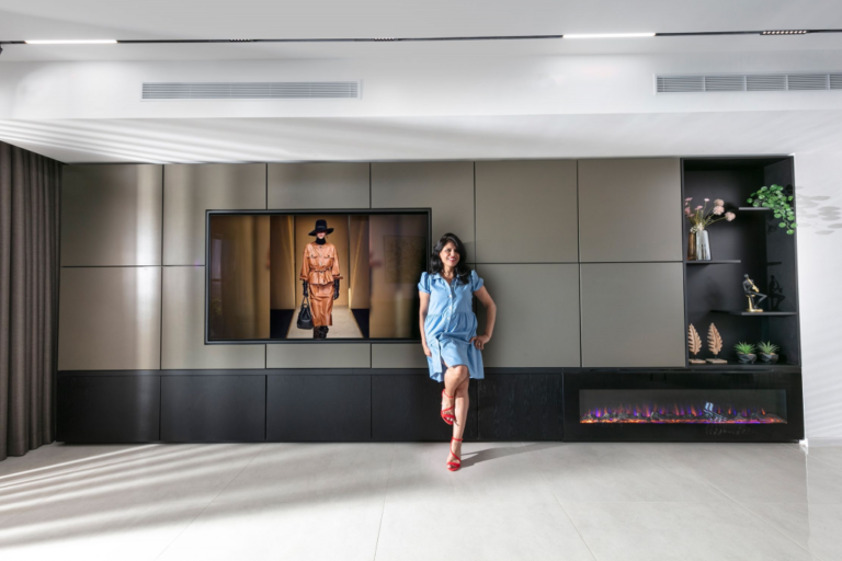 הקמין, שמתחבר לנגרות עם הפורניר השחור של חיפוי הקיר, מעניק אורך ומתחבר ומתמזג ביחד עם העיצוב של כל הקיר טלוויזיה.