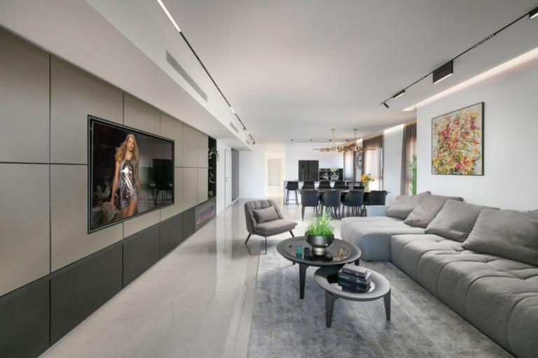“הזוג קיבל את הפנטהאוז ריק, זאת אומרת לא היו בכלל קירות – היה ריצוף, ממ”ד ומקלחת ילדים”, מספרת מאיה. “קיבלתי פנטהאוז נקי מקירות ועליו התחלתי לבצע תכנון מלא עבור משפחה עם 3 ילדים בני 15, 10 ותינוק. מבחינתי, בית מתחיל מתכנון נכון ועיצוב פנים זורע בו נשמה ולכן התחלתי מהבנת צרכי המשפחה.