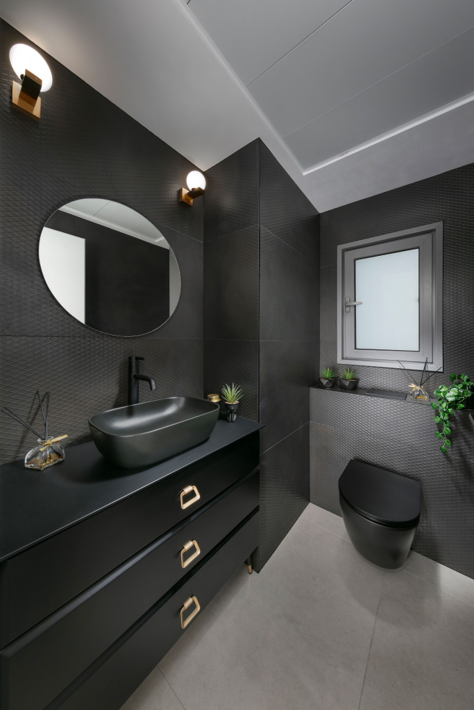 הצבע השחור הדומיננטי משתלב נפלא גם בשירותי האורחים, המעוצבים בדיוק פלאי ומרתק. החיפוי השחור בעל טקסטורה בולטת יוצר מראה יוקרתי של מלון חמישה כוכבים יחד עם מראה וכיור המשתלבים עם אופיו המלכותי של החדר, בשילוב נגיעות ירוק וזהב באמצעות עציצים וידיות.