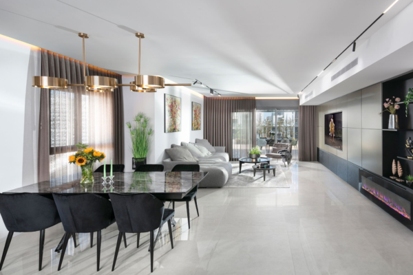 הפנטהאוז, שתוכנן במקור ללא קירות פנים בפרויקט של הקבלן שמשון זליג, מול עזריאלי ראשונים, הוסב לפנטהאוז 6 חדרים וכולל מטבח גדול עם אי הניצב במרכזו, סלון רחב ידיים, חדר שינה מרכזי עם חדר רחצה, וחדרי ילדים – כולם בגווני שחור בשילוב זהב וגוונים בהירים, אשר יחדיו מפיחים חום, צבעוניות וחיים בבית.