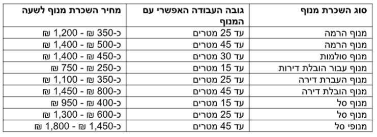 רגע לפני ששוכרים מנוף הרמה או מנופים מכל סוג אחר, חשוב לסקור מחירון השכרת מנופים באינטרנט, מה שאמור לקחת כמה דקות בודדות בלבד. לסיוע בעניין, ניתן להיעזר במחירון הבא: