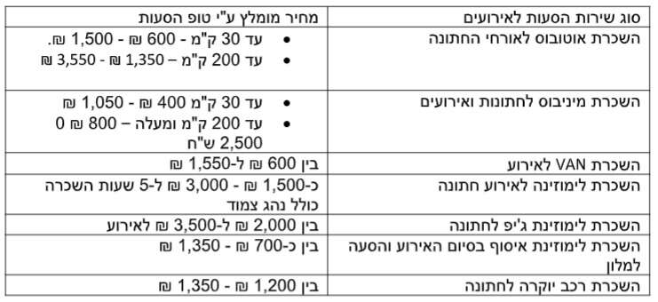 - מחיר השכרה ליום – עלויות השכרת רכב הסעות לחתונה יכולות לנוע בין מאות לבין אלפי שקלים (ליום או לפי שעה).