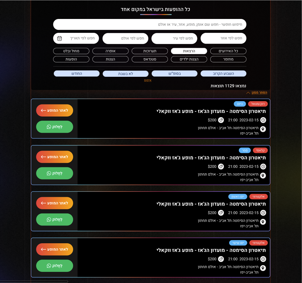 תכירו את אתר הופעות בו תוכלו למצוא מעל ל-2,500 הופעות קרובות מדי יום בישראל בשלל קטגוריות, בין אם זה מופע סטנדאפ עד לתערוכות אומנות והצגות לילדים תוכלו למצוא הופעות שקורות היום, מחר ולפי תאריך.