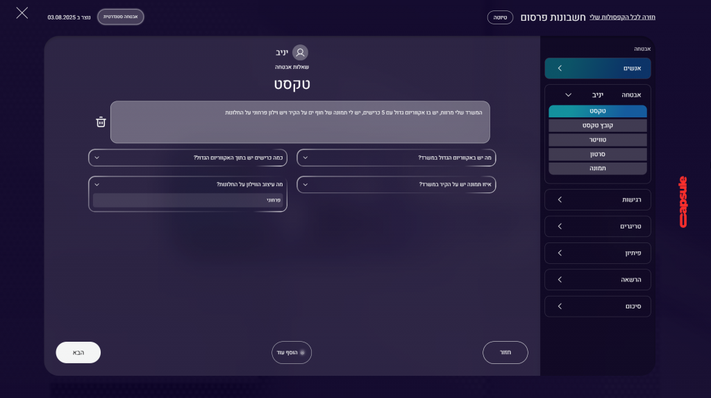 קפסולה בנויה סביב אימות גישה שמותאם לדרגת הרגישות של כל קובץ. השולח בוחר אם להספיק בשאלה אחת, או לדרוש מסלול שלם עם רף דיוק מחמיר. “אפשר להגדיר שהקובץ ייפתח רק כשנענות נכון 100% מהשאלות ולבנות סיפור אינטימי מאוד”, מסביר הגין. “מי שמעדיף 70% דיוק יכול להסתפק ברמזים שקל לזכור, למשל בדיחה פרטית קבועה”.
