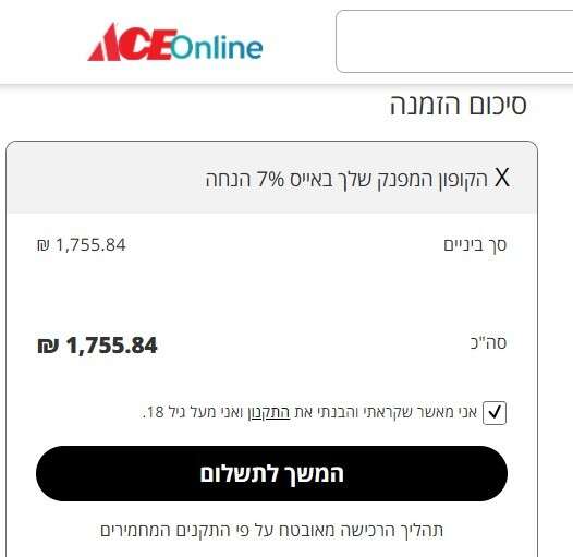 בבדיקת קופון אייס הופחת סכום נוסף של 122.91 ₪ ממוצר שכבר היה במבצע, לאחר הפעלת קופון של 7% הנחה בעמוד התשלום.