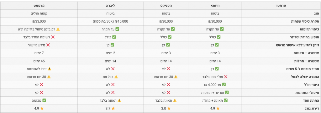 לפני הנתונים, חשוב להבין הבדל יסודי אחד: מרפאט היא קופת חולים – לא חברת ביטוח. המשמעות הפרקטית היא שונה לחלוטין: אישורים מראש, רשימת מרפאות מוגדרת, ומנגנון תביעה שונה. שלוש האחרות – חיותא, הפניקס וליברה – הן ביטוחים רגילים שנערכים לפי חוק חוזה הביטוח.