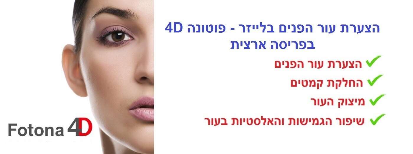 FOTONA 4D היא הפיתוח המתקדם ביותר בעולם כיום בתחום הצערת העור. הטיפול החדשני ביותר בעולם המביא לחידוש, ריענון, הצערה והחלקת קמטים עם התוצאות הטובות בעולם ובתוך זמן קצר. הטיפול בפוטונה 4D מורכב מארבע טכניקות שונות המשולבות ביחד ומאפשרות קבלת תוצאה מושלמת. האזורים בהם מתקבלות התוצאות הטובות ביותר של הצערה ומיצוק העור הנם: הפנים, הצוואר, המחשוף, הזרועות, הבטן הרגליים והישבן. הטיפול בטכנולוגיה זו מחדש את עור הפנים וממריץ את קצב ייצור הקולגן והסקרטין המביאים למראה עור מוצק וצעיר יותר.