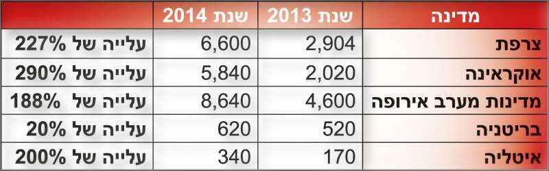 כתוצאה מכך, לא פחות 26,500 עולים חדשים הגיעו בשנת 2014 לישראל, עלייה בשיעור חד של 32% לעומת 2013. כך עולה מנתוני הלשכה המרכזית לסטטיסטיקה. מדובר במספר שיא של עולים בעשור האחרון. בראש הרשימה נמצאת צרפת, שממנה הגיעו בשנה החולפת לא פחות מ- 6,600 עולים, לעומת 2,904 שהגיעו מצרפת ב—2013. מדובר בזינוק של 227%. יוזכר, כי משרד העלייה והקליטה ובסוכנות היהודית גיבשו תוכנית "צרפת תחילה", בנוסף לתוכניות לחשיפתם של אלפי צעירים מצרפת לאפשרויות החיים בישראל.