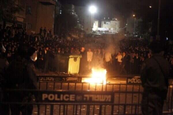 Two haredi soldiers walking through the ultra-religious Mea Shearim neighborhood in Jerusalem Sunday night became the focal point of a violent protest carried out by angry residents in the area, Israeli media reported Monday. The protesters, belonging to an extreme sect of haredi Judaism, threw rocks at the soldiers and lit trash cans on fire. Police and firefighting units were called to the scene to calm the crowd and put out the fires. The soldiers managed to escape the neighborhood without injury. "We condemn all the violence that transpired. This is not our way, the [violent protesters] were fringe elements," spokesperson for last week's 30,000-strong haredi protest against IDF enlistment, Pini Rosenberg, said. Rosenberg played down the Israeli media reports of the event. "Also, I happened to be present in the area and the reports of what took place have been blown completely out of proportion," he said. Some 30,000 members of the ultra-Orthodox community gathered at the Jerusalem IDF recruitment offices on Thursday to protest against the "enlistment decree" hanging over their heads. The protest comes as the Peri committee (named after Science and Technology Minister Yaakov Peri from Yesh Atid) prepares to release its conclusions as to how to draft greater numbers of haredim. Protest organizers had called for a peaceful demonstration, but police reported several violent confrontations on Thursday. Protesters apparently started throwing blunt objects and stones at police, lightly wounding eight officers. Some of the wounded officers were taken to the Shaare Zedek Medical Center for treatment. Some demonstrators set garbage cans on fire, and police responded by firing smoke and stun grenades. Ten demonstrators were arrested during the disturbances.