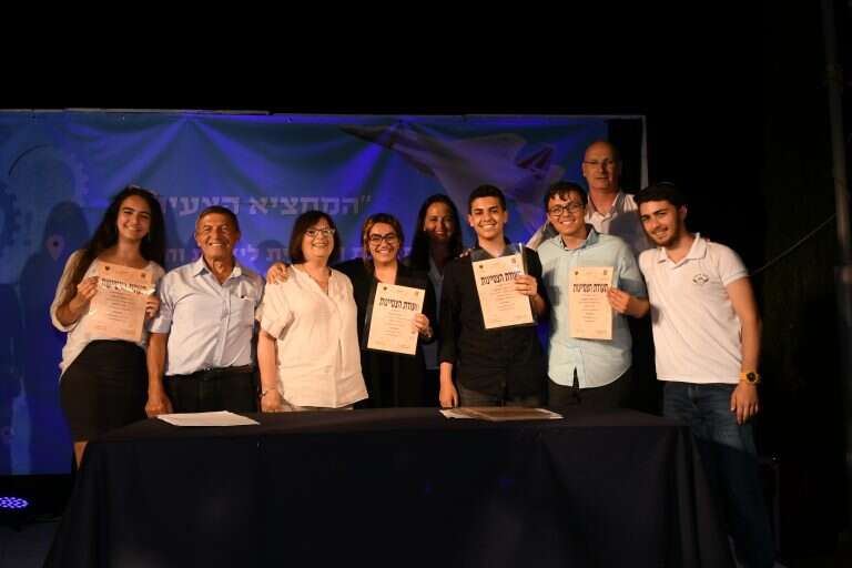 בתמונה:תלמידי חט”ב תמר אריאל בנתניה זוכים בתעודת הצטיינות בעבור המצאה מערכת כלים שלובים לבעלי מוגבלויות