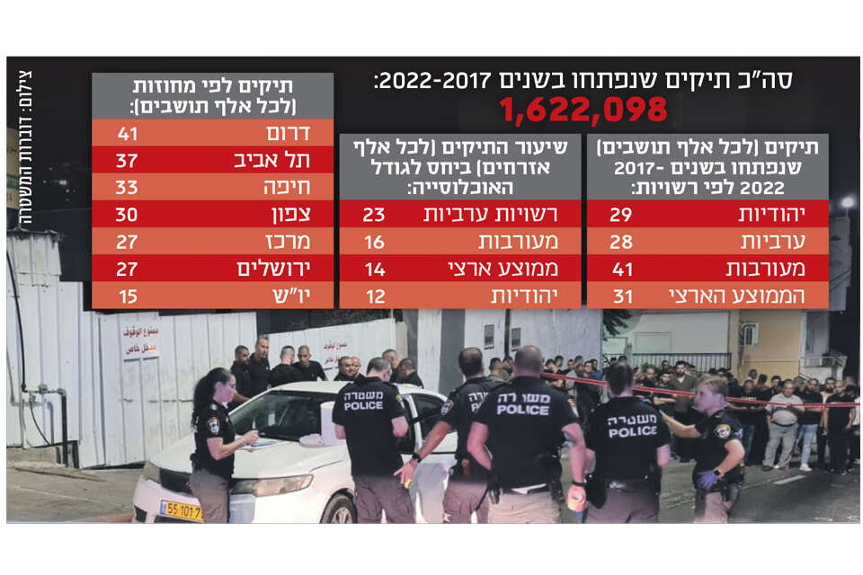 דו"ח של מרכז המחקר של הכנסת שהוגש לוועדה לביטחון הפנים, בראשות ח"כ צביקה פוגל, מעלה כי מתחילת 2017 ועד סוף אוגוסט 2022 נפתחו במשטרה 1,622,098 תיקים על עבירות שבוצעו ברשויות המקומיות בישראל - ממוצע של 31 תיקים בשנה לכל אלף תושבים.