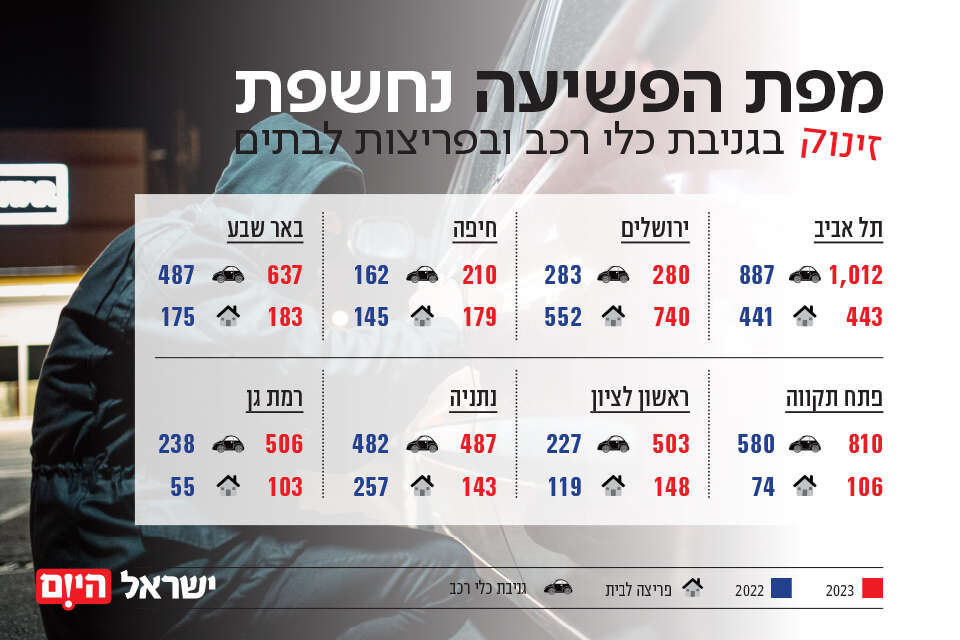 מנתוני משטרת ישראל על חצי השנה הראשונה של שנת 2023, שהגיעו לידי "ישראל היום", עולה כי נרשם זינוק בערים המרכזיות בישראל בפריצות ובגניבות כלי רכב, פריצות לדירות ופריצות לבתי עסק. על פי הנתונים, תל אביב היא העיר המובילה בכל המדדים האמורים. מהנתונים עולה עוד כי ברמת גן ובראשון לציון הוכפל מספר הרכבים שנגנבו בהן לעומת התקופה המקבילה בשנה שעברה.