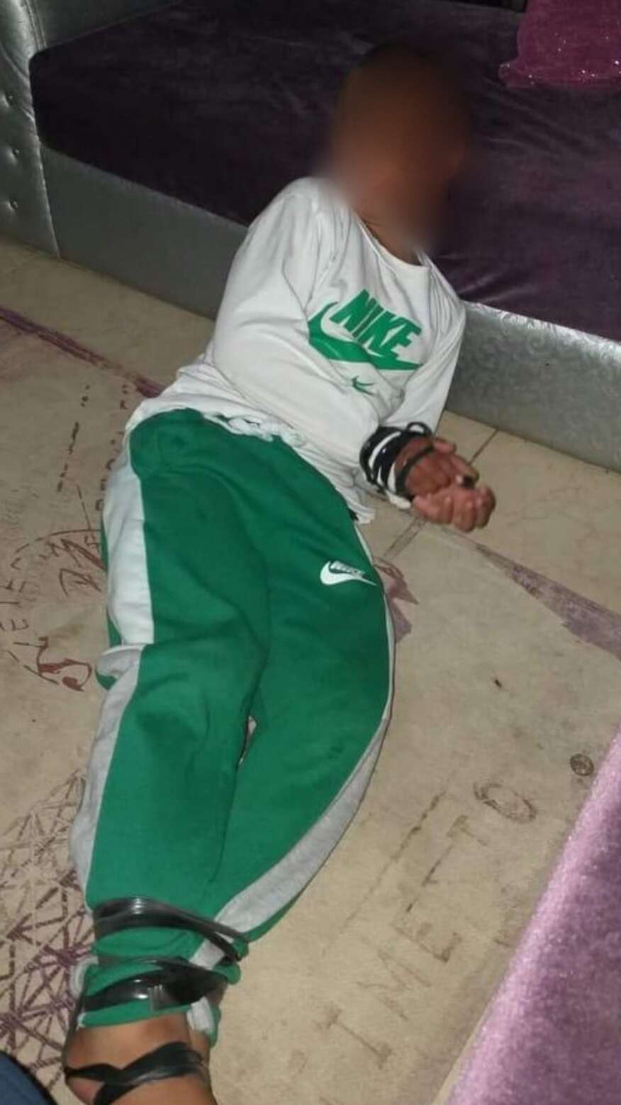 החשוד העלה תמונה לפייסבוק, שבה רואים את הבן שלו כאשר ידיו ורגליו אזוקות ברצועה שחורה, ולצד התמונה רשום "כשהבן שלך משגע אותך ולא נותן לך להתעסק עם הפלאפון".