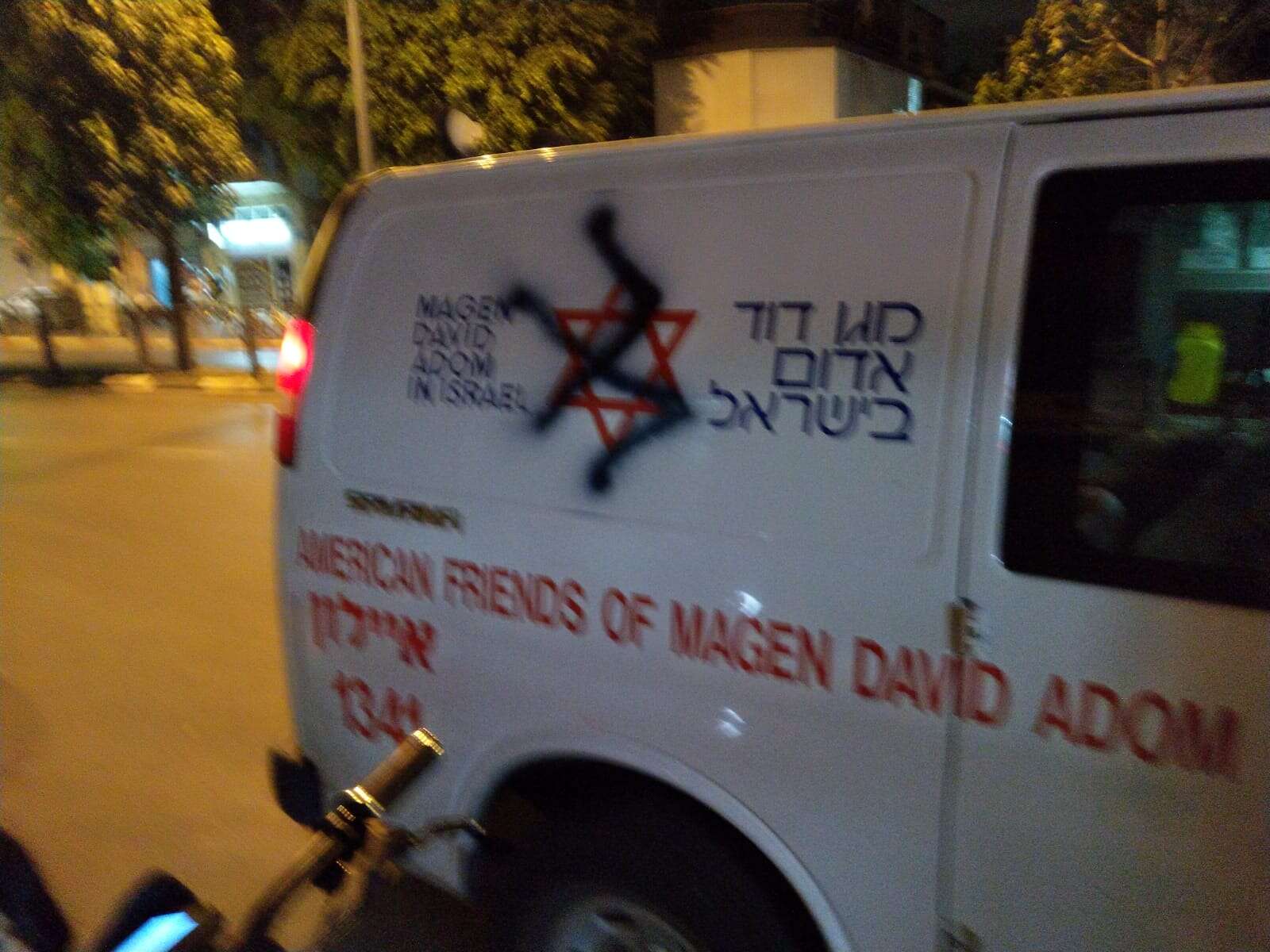צוות מגן דוד אדום הגיש הערב (יום שישי) תלונה במשטרה בעקבות צלב קרס שרוסס על אמבולנס שהגיע לטפל בחולה ברחוב ההגנה בתל-אביב.