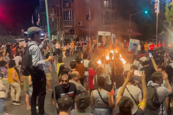 22:55: במקביל להפגנות משפחות החטופים, מפגינים מוחים גם בתל-אביב מול שער הקריה ובדרך בגין. הם מבעירים מדורות, משתטחים על הכביש ודורשים לגבש עסקה מיידית בה ישוחררו החטופים. (אבי כהן)