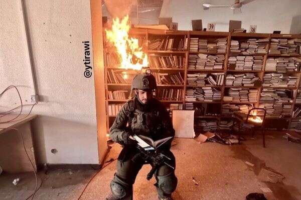 "אירוע חמור": לוחם צה"ל תועד כאשר הוא שורף ספרים בספרייה של אוניברסיטת אל-אקצא שבעיר עזה. בשלב זה לא ידועה זהותו של הלוחם. בתמונה מתועד החייל יושב וקורא ספר כאשר מאחוריו נדלקת שריפה מתוך מספר רב של ספרים.