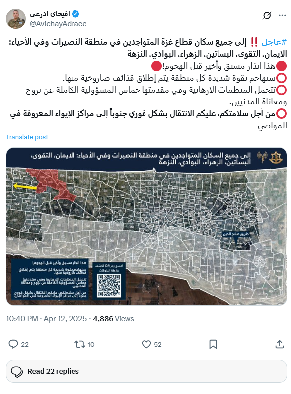 22:56: דובר צה״ל בערבית, אל״ם אביחי אדרעי: "אל כל הנמצאים במרחב נוסייראת והשכונות: אלאימאן, אלתקוא, אלבסאתין, אלזהראא', אלבואדי, אלנזהה. זו אזהרה מוקדמת לפני תקיפה! כוחות צה"ל פועלים במרחב בעוצמה, נתקוף בעוצמה כל אזור ממנו ישוגרו רקטות. האחריות לפינוי ולסבלם של האזרחים הוא על ארגוני הטרור ובראשם חמאס. למען ביטחונכם, נועו מיד דרומה למחסות מוכרים במואסי". (לילך שובל)