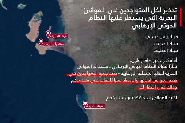 דובר צה״ל בערבית, אל״ם אביחי אדרעי פרסם לפני זמן קצר (ראשון) אזהרה בחשבון ה-X שלו: "אזהרה לכל הנמצאים בנמלי הים שבשליטת שלטון הטרור החות'י: נמל ראס עיסא, נמל אלחודידה, ונמל א-סאליף. זוהי אזהרה דחופה וחשובה".