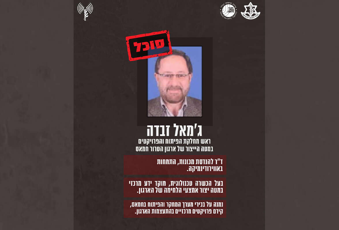 3. גמאל זבדה - ראש מחלקת הפיתוח והפרויקטים במטה הייצור של חמאס. מהווה המחולל המרכזי של מערך היצור הרקטי של חמאס. דוקטור להנדסת מכונות המתמחה באווירודינמיקה, בעל הכשרה במגוון תחומים טכנולוגיים ומהווה מוקד ידע מרכזי ומשמעותי ביותר במטה הייצור של החמאס. נמנה על בכירי מערך המחקר והפיתוח בחמא"ס, עוסק בקידום פרויקטים מרכזיים בהתעצמות חמאס.