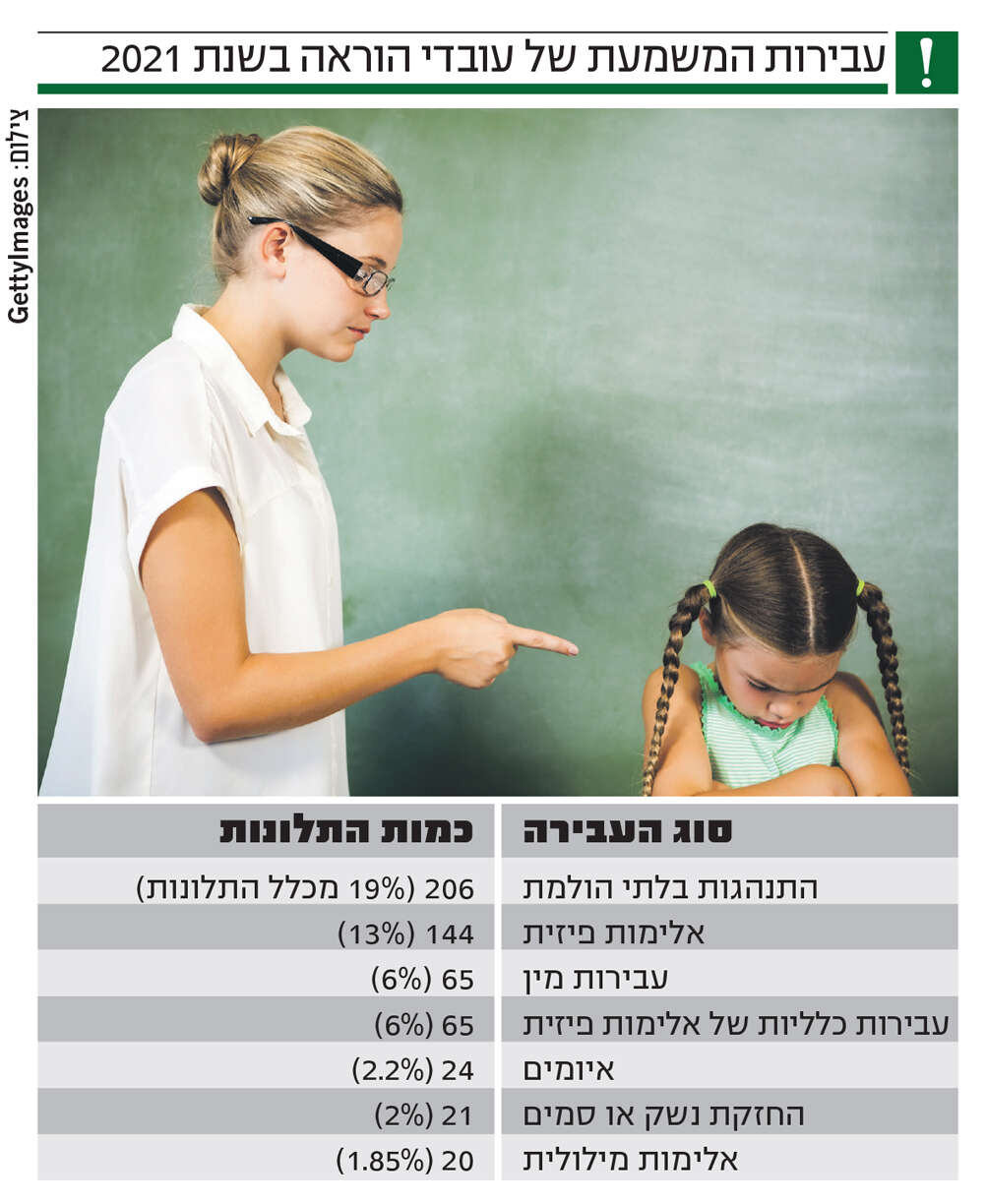 אם בשנת 2019 הוגשו 1,050 תלונות בגין עבירות משמעת של עובדי ההוראה, הרי בשנה שאחריה עלה מספרן ל־1,067, ואילו בשנת 2021 מספר התלונות הגיע ל־1,086 - בעיקר בגין התנהגות בלתי הולמת של עובדי ההוראה (ראו טבלה).